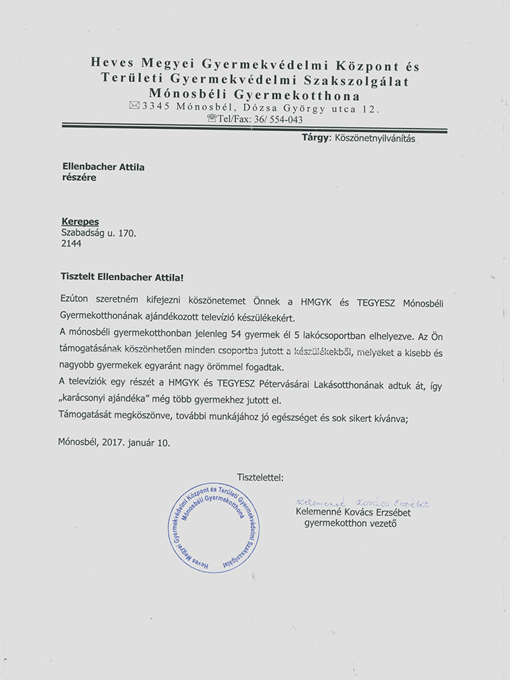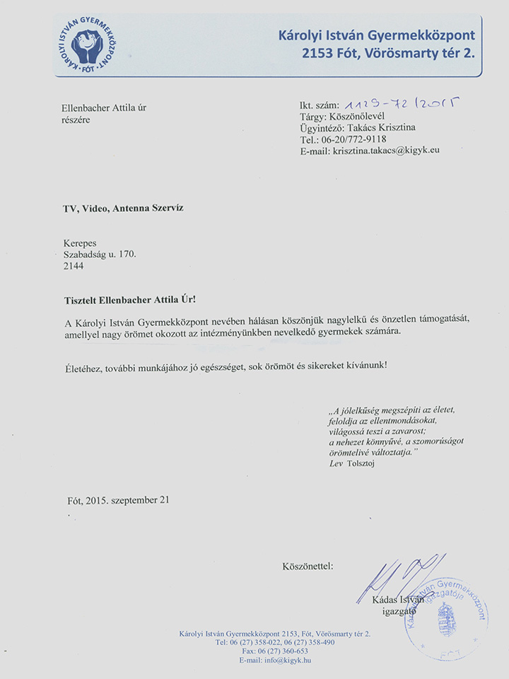 Károlyi István gyermekközpont köszönőlevél, Fót