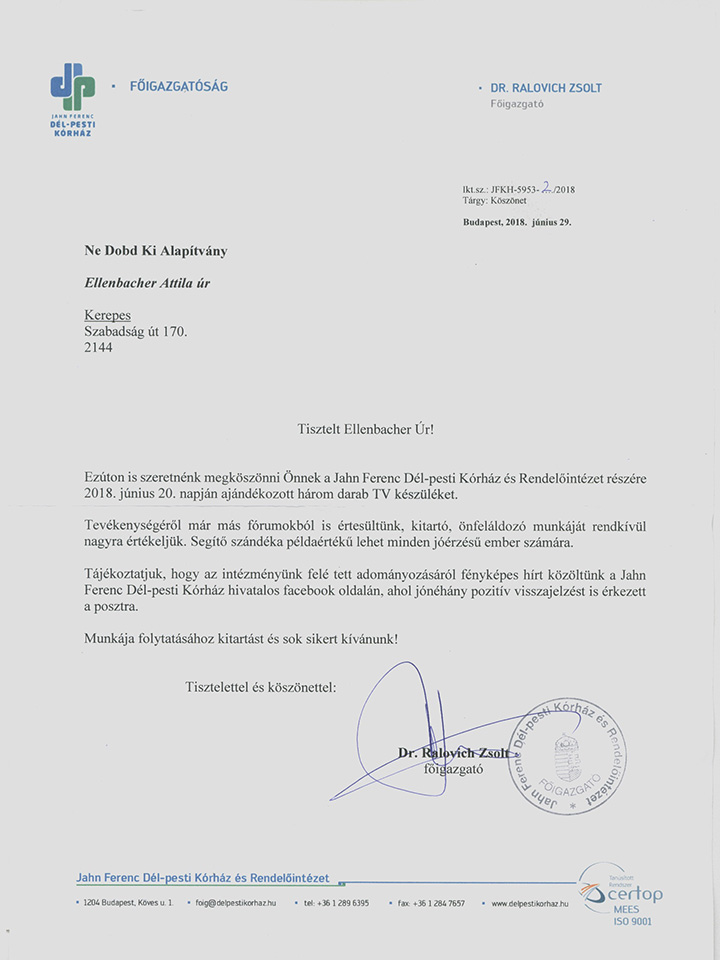 Jahn Ferenc Kórház köszönőlevél