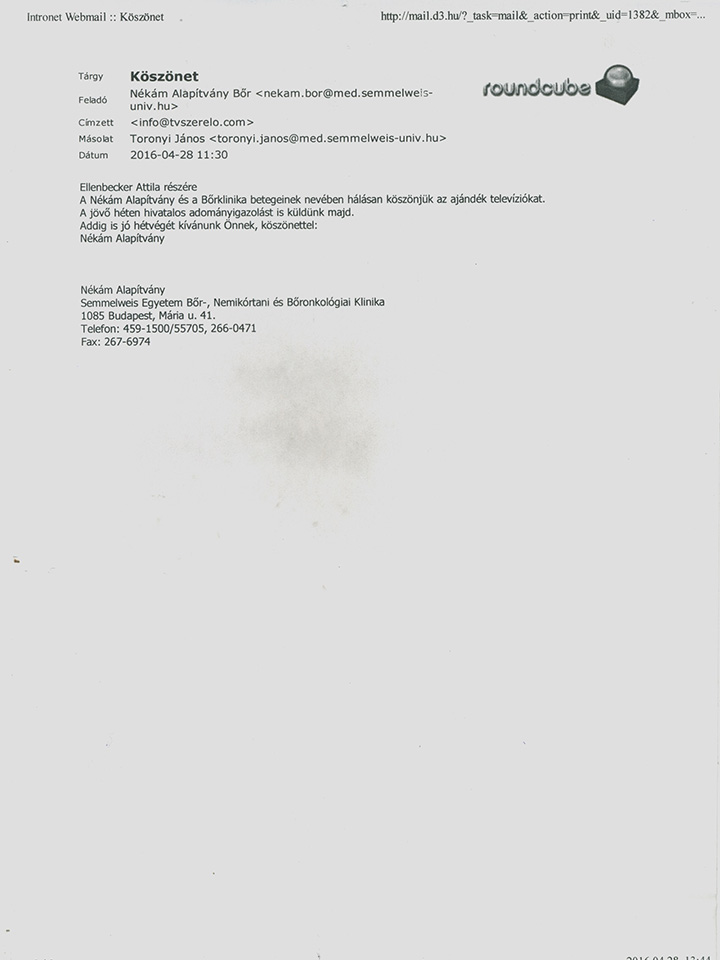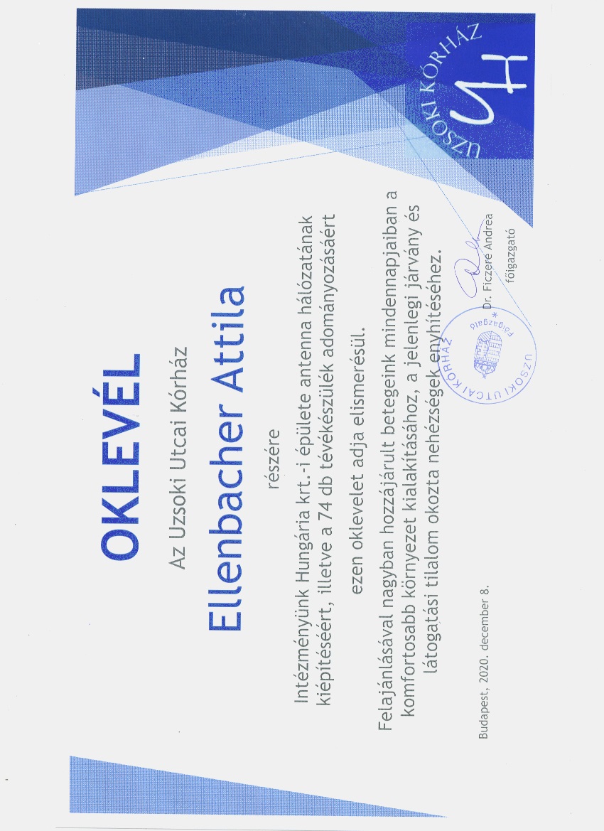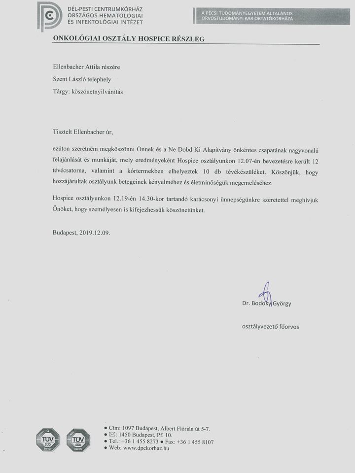 Szent László Kórház hospice részleg antenna kiépítés köszönő levél.