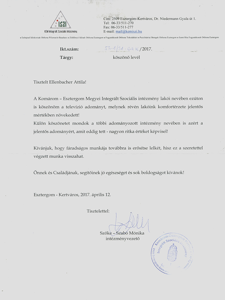 Komárom-Esztergom-megyei Integrált Szociális Intézmény Köszönőlevél