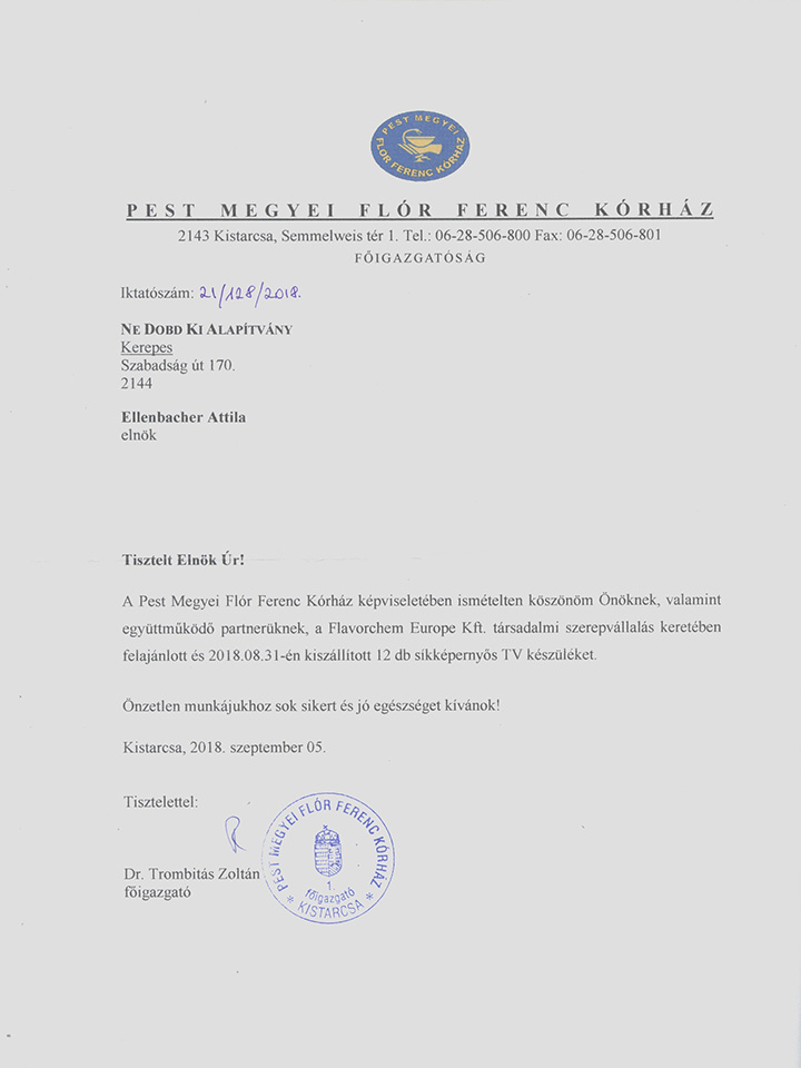 Kistarcsa, Flór Ferenc Kórház köszönőlevél