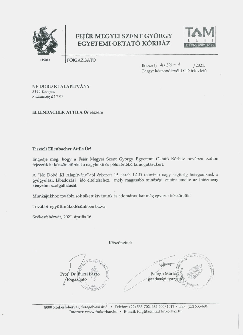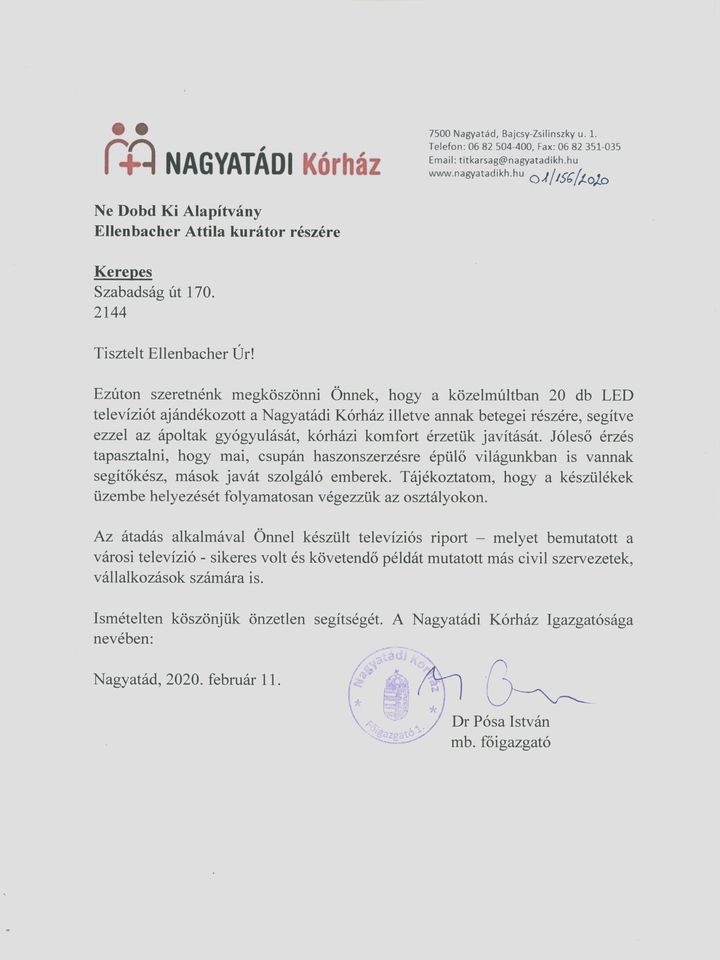 Nagyatádi Kórház köszönőlevél