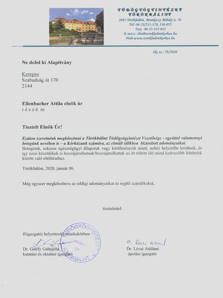 Törökbálinti Tüdőgyógyintézet köszönőlevél