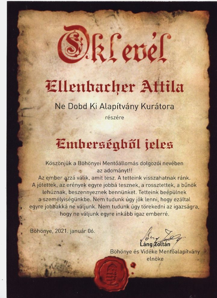 Böhönye mentőállomás köszönőlevél