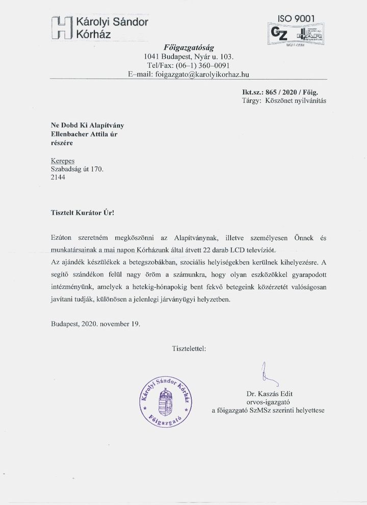 Károlyi kórház köszönőlevél
