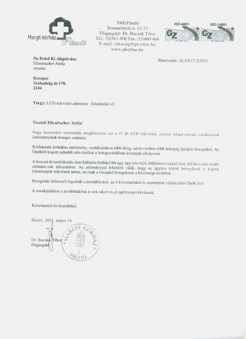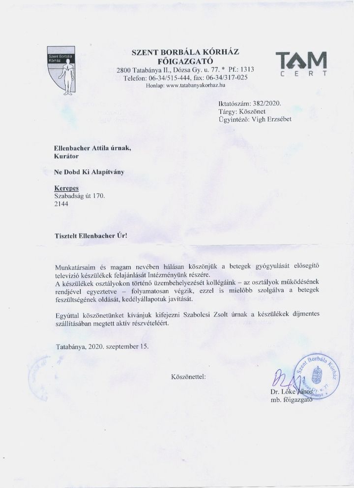 Szent Borbála Kórház köszönőlevél