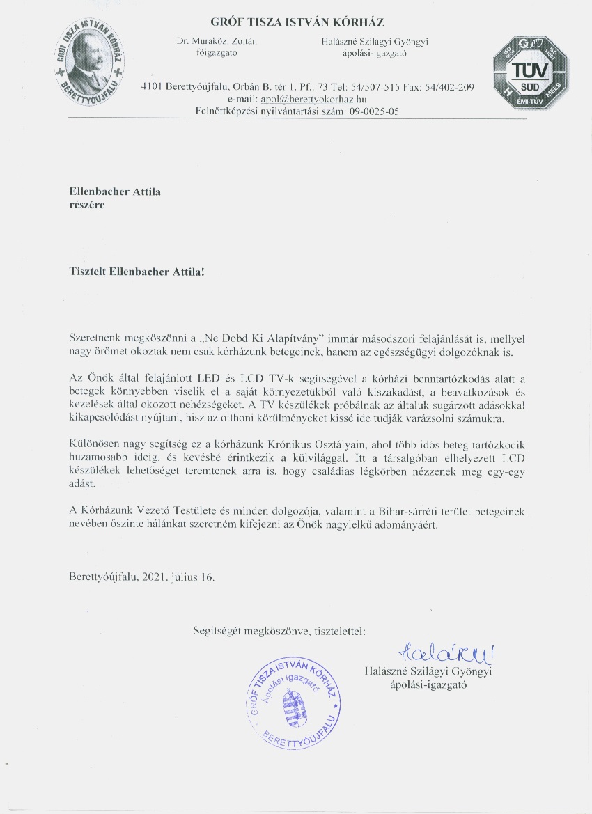 Gróf Tisza István kórház köszönőlevél